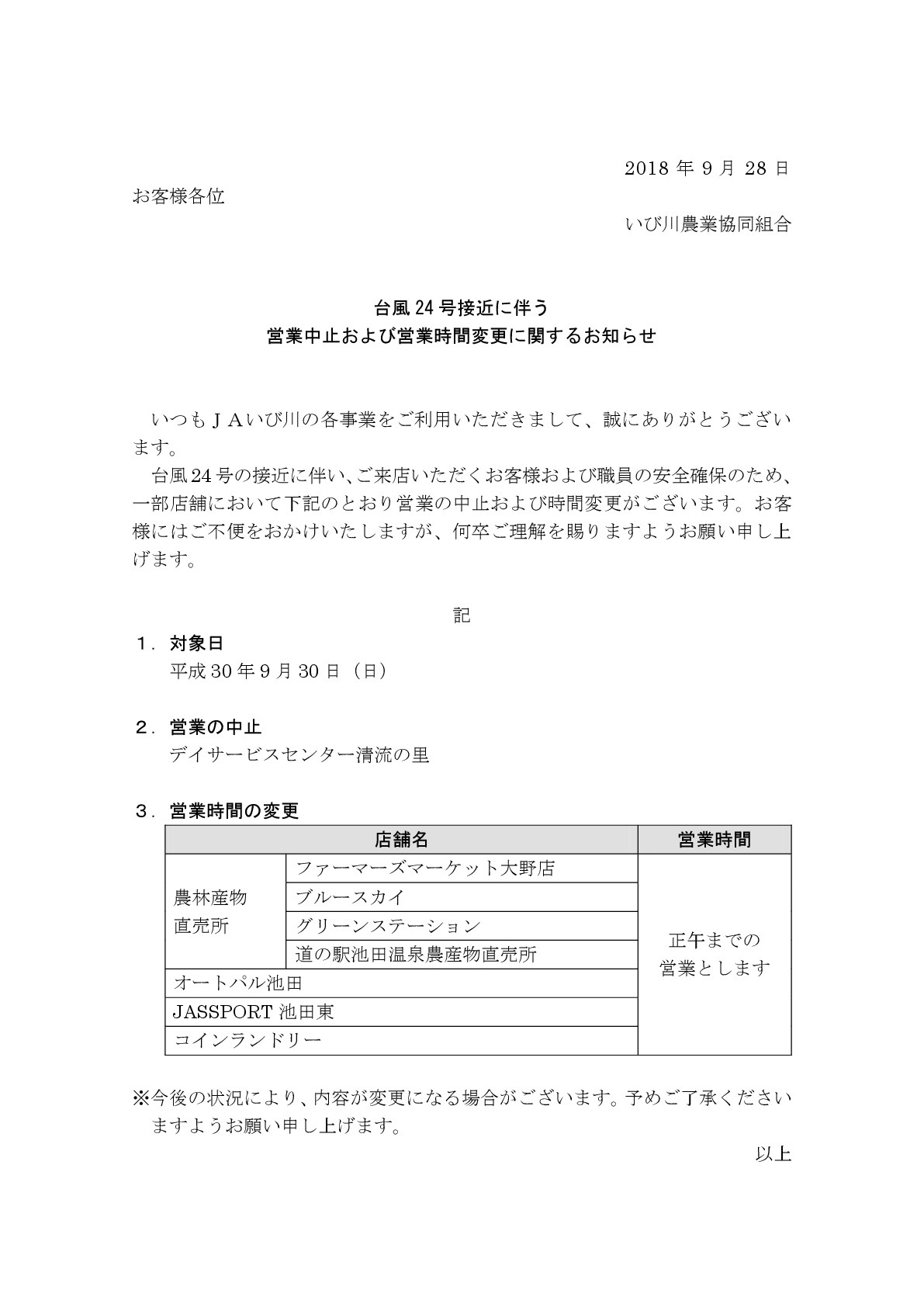 台風24号接近に伴う営業中止および営業時間変更に関するお知らせ