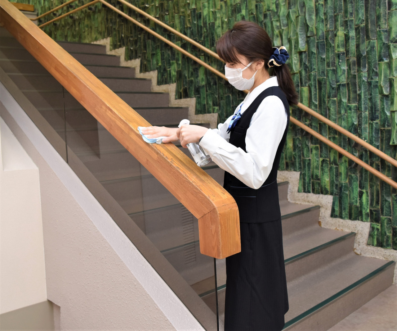 店頭窓口および外務活動を行う職員は、営業時間中は原則マスクを着用し勤務しています。