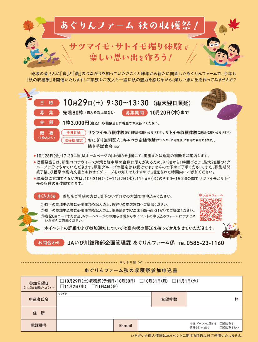 ・収穫祭に参加できない方は10月31日(月)~11月2日(水)、11月4日(金)の9:00~15:00の期間中にサツマイモとサトイモの収穫体験のみご参加いただけます。