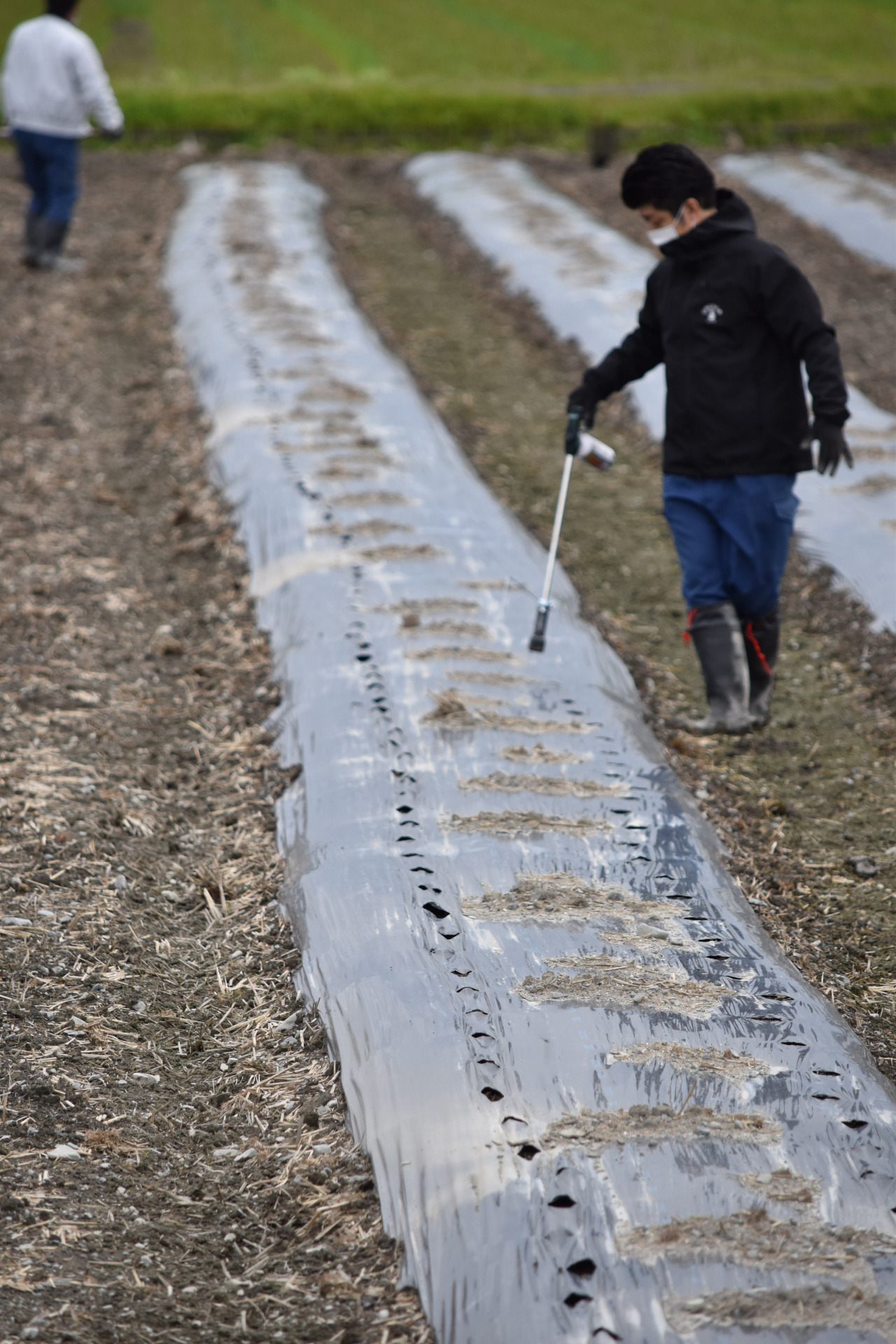 4月22日に、種をまくための下準備である、マルチの穴開け作業を営農課や養基支店の皆さんに頑張っていただきました。
