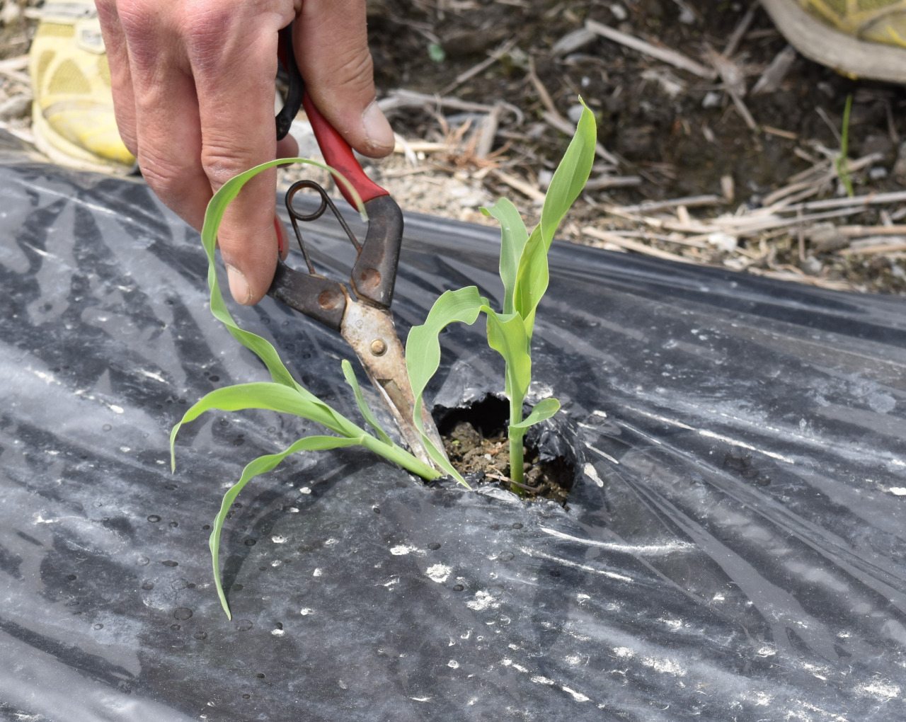 サツマイモの定植後は、順調に成長しているトウモロコシの間引きを行いました。