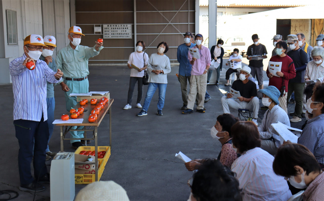 大野町かき振興会は9月24日、柿「早秋」「太秋」の出荷を目前に目ぞろえ会を行いました。生産者や市場関係者らが参加し、同会の技術部員から着色ムラや日焼け果、傷の程度など複数の選果基準について説明を受け、高品質出荷に向けて意思統一を図りました。