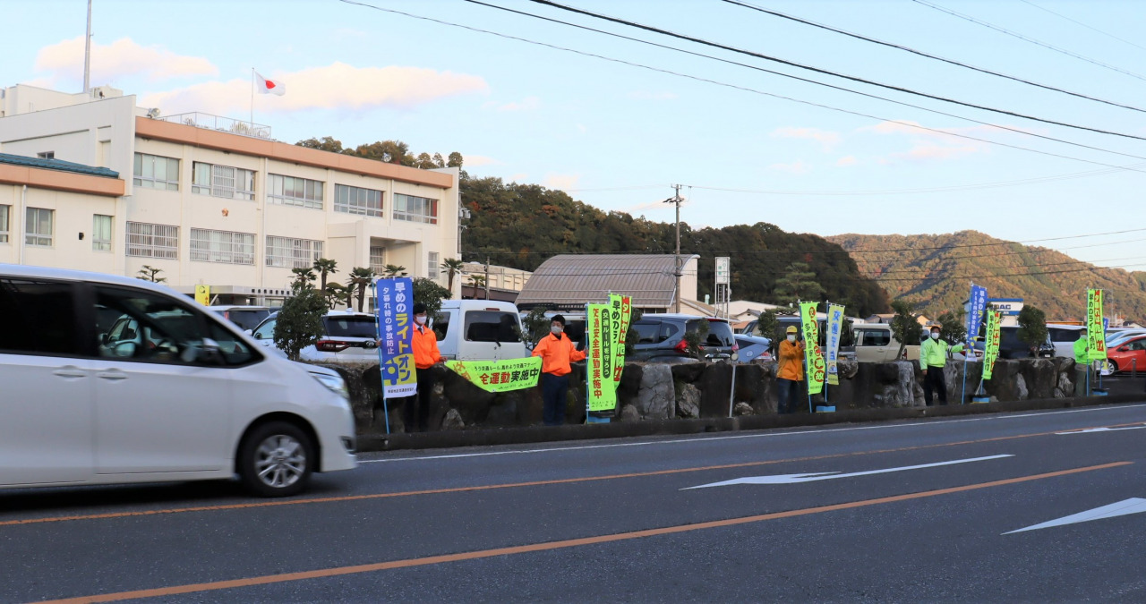 夕暮時の運転にはご注意を! 2022年11月18日(金) 地域貢献 当JAは、日没と帰宅時間が重なり、夕暮れ時の事故等が多発していることから、揖斐警察署、交通安全協会と連携し、11月15日に揖斐警察署前で交通安全運動を実施しました。 関係者らとのぼりや横断幕をかかげ、ドライバーへ交通ルールの順守や早めのライト点灯を呼びかけました。