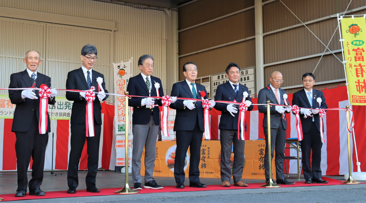 揖斐郡ブランド推進協議会は11月18日、大野町の特産品である富有柿の香港への輸出成功を願い、大野果実共同選果場で出発式を行いました。