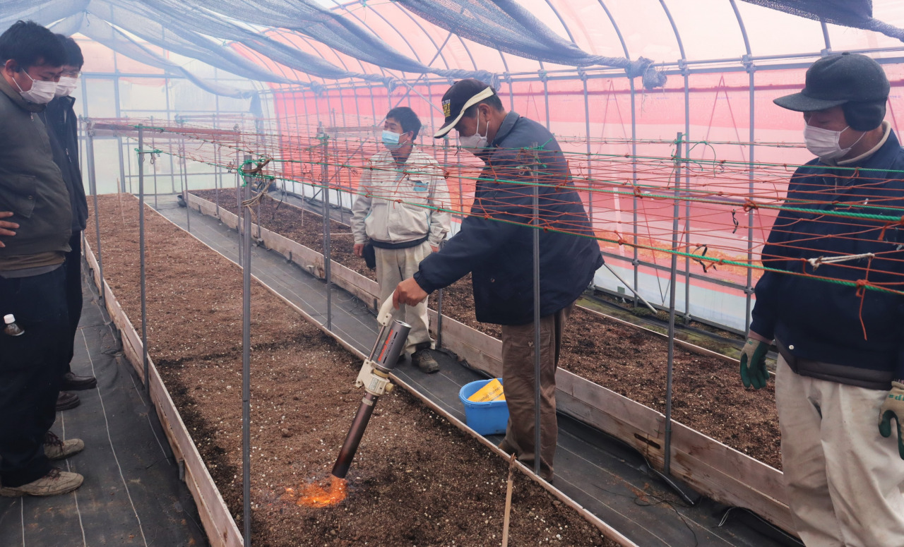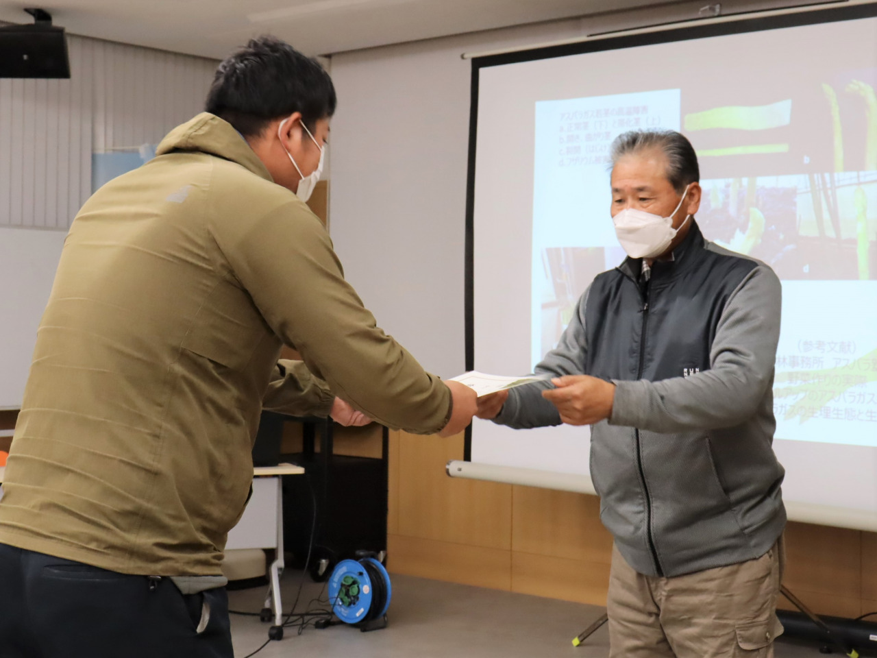 アスパラガス帰農塾の閉校式を行いました 2022年12月23日(金) イベント 12月17日に担い手サポートセンター揖斐アスパラガス部会と揖斐農林事務所、当JAが連携する「アスパラガス帰農塾」の閉講式を開きました。全4回の講義を終え、4人の受講者が修了証書を受け取りました。 最後の講義では土づくりや病害虫の防除に関する座学と茎葉の刈取りやほ場の表面焼却の実習を行いました。