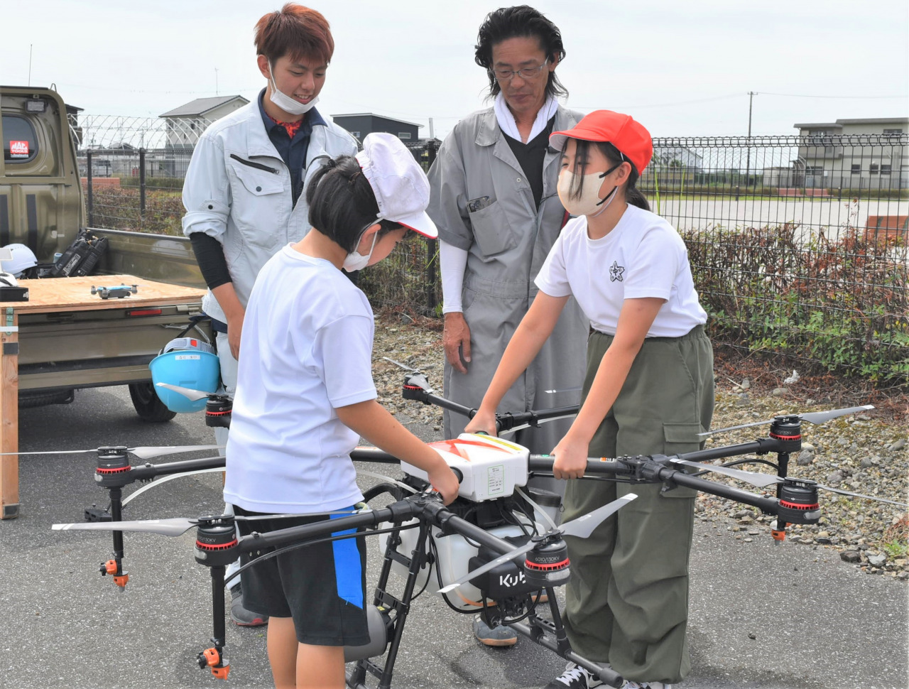 中小学校児童がドローンの農作業について学びました 2024年06月27日(木) 地域貢献 中小学校のお米づくり学習の一環で、ドローンを使った農作業見学を行いました。大野町で水稲を栽培し、当JA青年部に所属する清水誠さんが講師となり、ドローンを操作して防除の模擬作業を行いました。また、地域の営農組合に所属する牧村忍さんは、溝切り作業について紹介しました。児童たちは「ドローンがかっこよかった」「大事な作業を学べた」と感想を話しました。