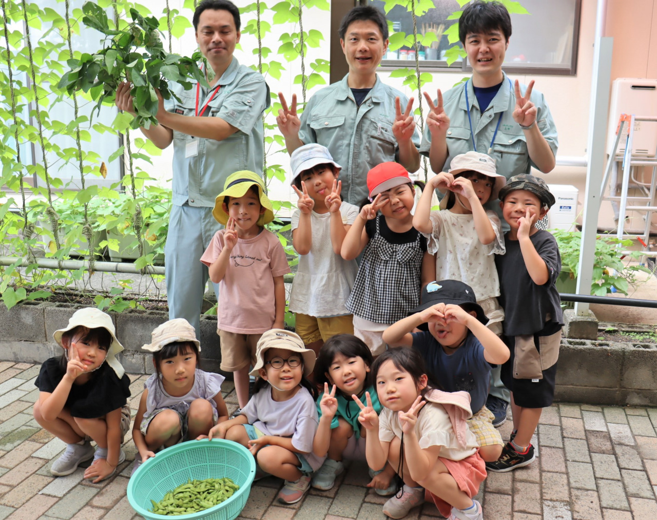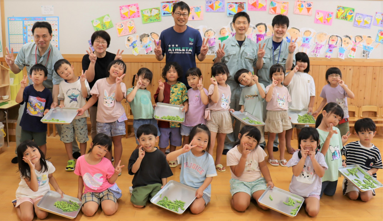 八幡支店と園児らが野菜栽培に挑戦! 収穫を行いました 2024年07月26日(金) 地域貢献 八幡支店は、食農教育活動を通して地域との絆を深めようと、支店運営委員会と協力して、園児たちと野菜のプランター栽培に取り組んでいます。7月26日、園児たちと一緒に育てた野菜の収穫を行いました。綺麗な緑色に実ったエダマメを収穫し、嬉しそうな笑顔が溢れました♪【市橋保育園】【片山保育園】