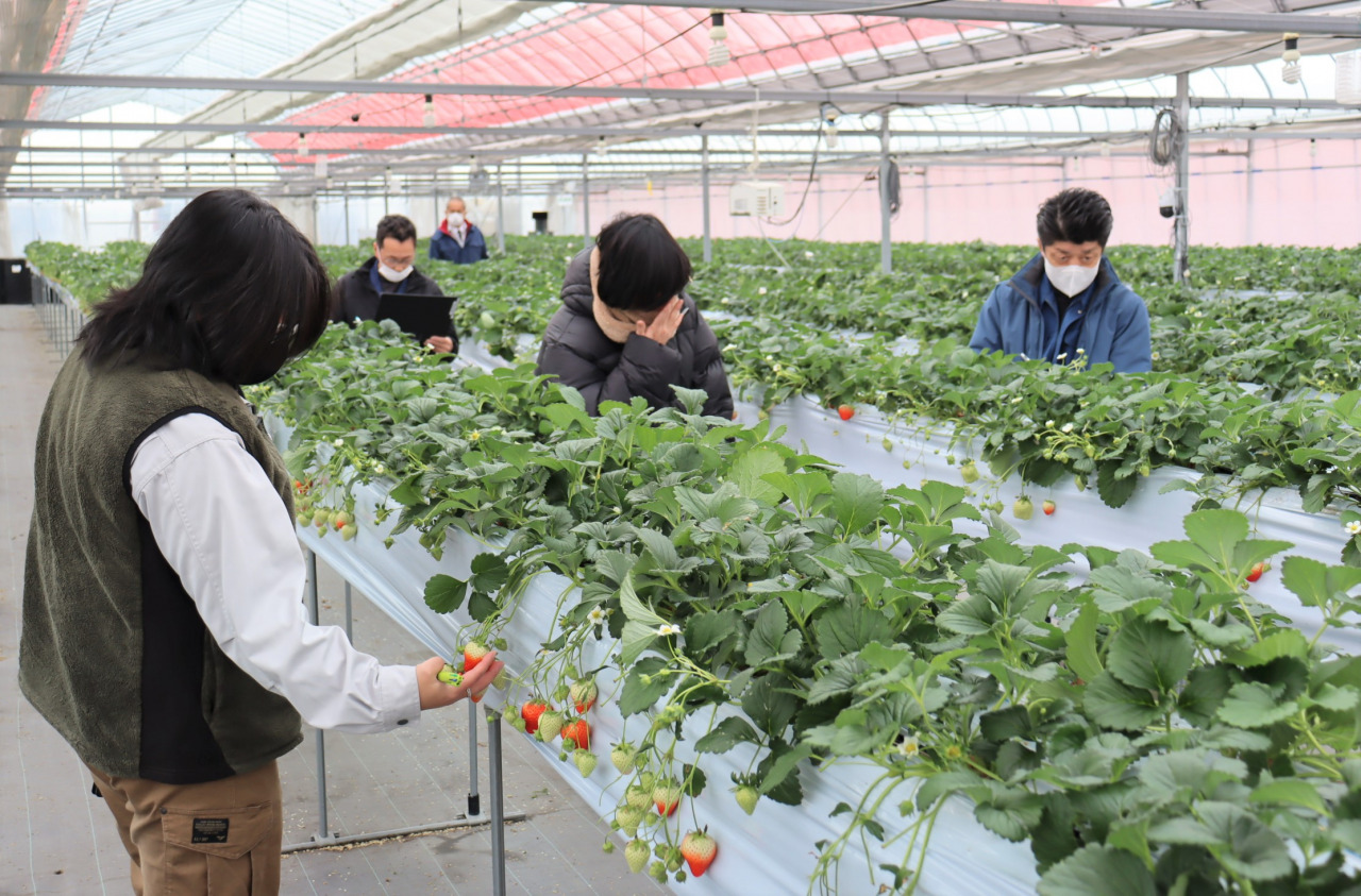 いちごの生産振興を目指して いちご圃場審査を実施 2025年01月30日(木) その他 いちごの栽培技術の改善や品質向上を目的とした「岐阜県いちご共進会」の地方審査を行われ、当JAと揖斐農林事務所の職員がいちご生産者のハウスをまわり、生育状況等について審査しました。3月には県審査が行われます。