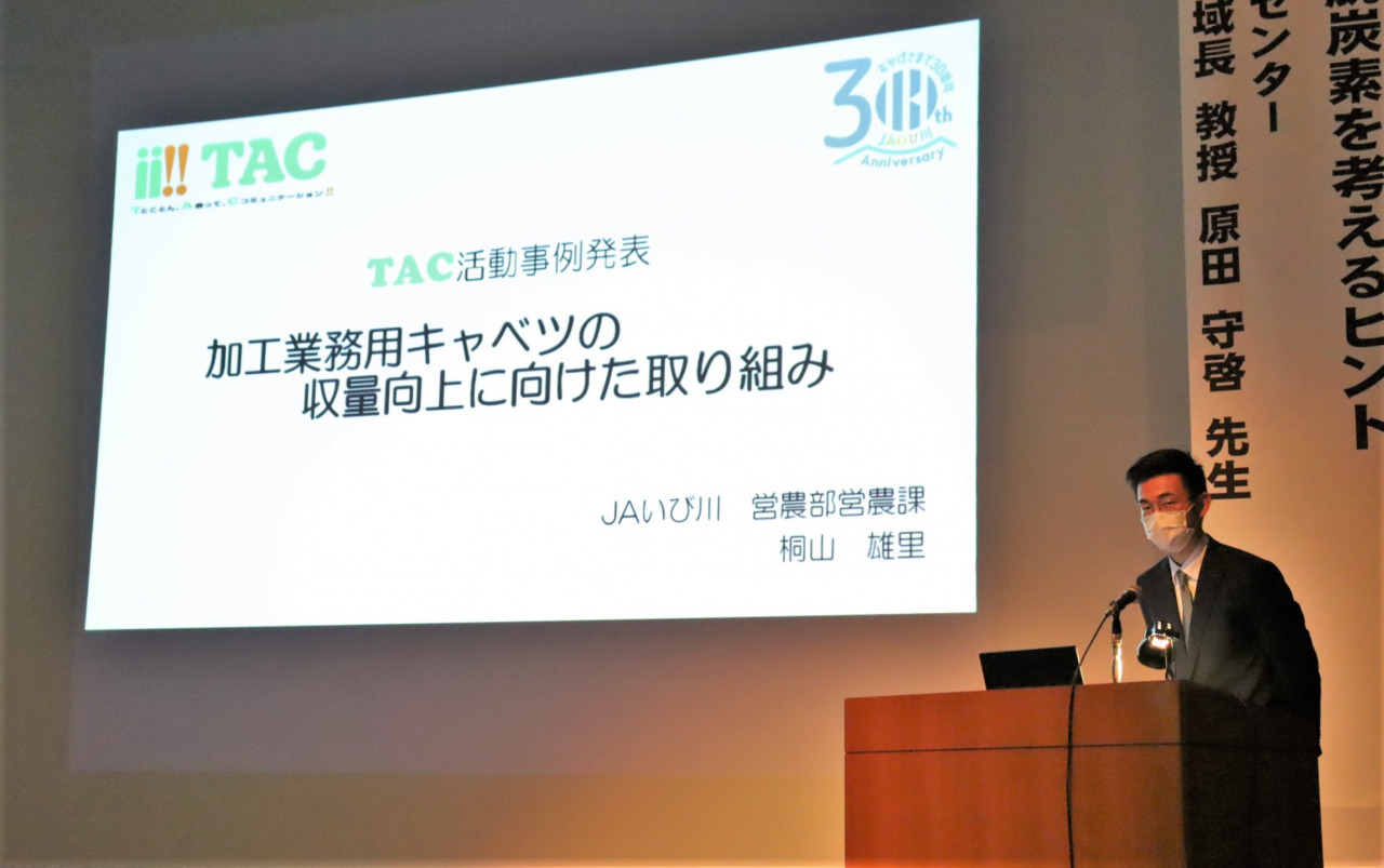 揖斐郡の農業を未来へ いび農業活性化研修 2025年02月13日(木) その他 農業者や当JA職員、行政職員が集い情報交換を行うことで、農業者の経営改善や地域の活性化を目指そうと、揖斐農林事務所・揖斐郡農業振興協議会主催の「いび農業活性化研修」が開催されました。TAC(農業経営相談員)の桐山雄里が、加工業務用キャベツの収量向上に向けた取り組みについて発表を行いました。また、気候変動への対応などに関する講演会が行われました。