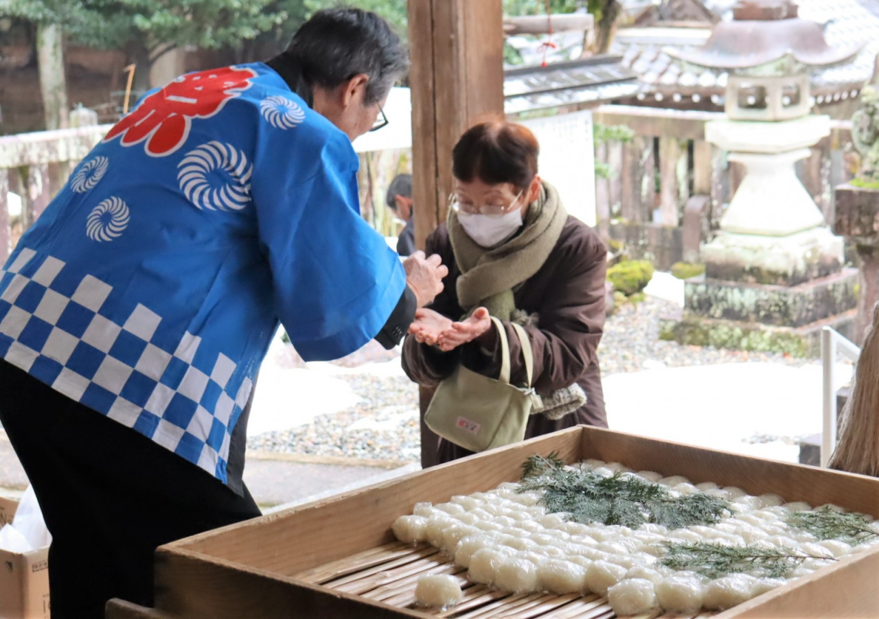 北方地区伝統行事 とりの子祭り 2025年02月17日(月) その他 揖斐川町北方地区の伝統行事「とりの子祭り」が行われました。江戸時代の凶作時に、飢えに苦しむ農民に、庄屋が鳥の子(卵)に見立てたおにぎりを配ったことに由来しています。多くの地元住民が参拝に訪れ、無病息災を願い「とりの子」が配られました。