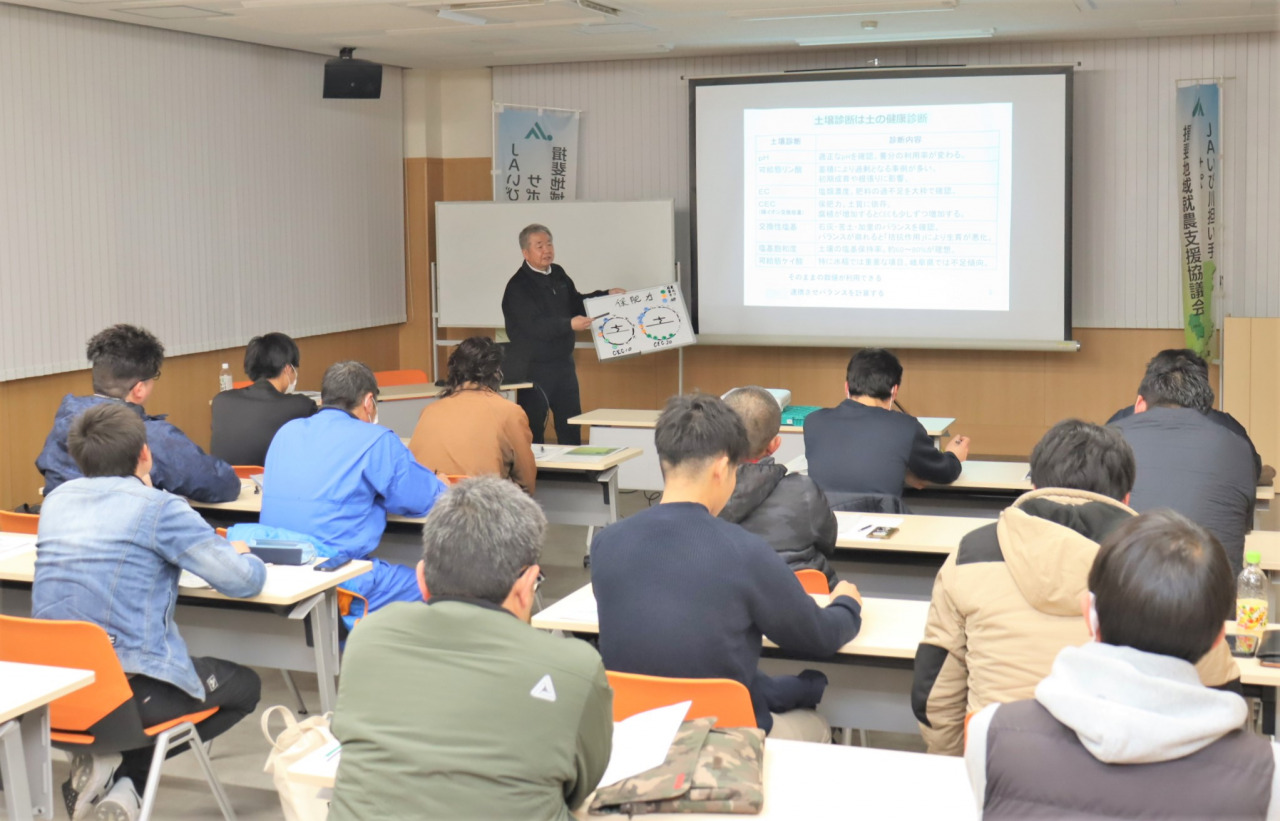 仲間とともに知識を深める 青年部勉強会を開催 2025年03月04日(火) 青年部 当JAと全農岐阜は、青年部員の農業に関する知識をさらに高めていただくことを目的に、青年部勉強会を開きました。バイオスティミュラント(植物や土壌により良い生理状態をもたらす物質や微生物)資材の特徴や使用方法、農作物の栽培に適した土づくりについて説明を行い、青年部員の皆さんは熱心に説明を聞いて知識を深めました。