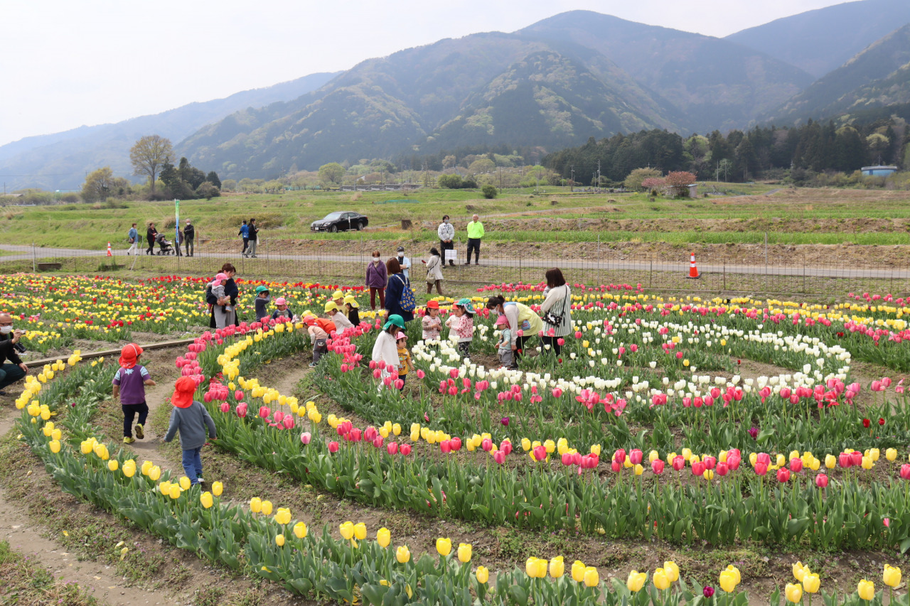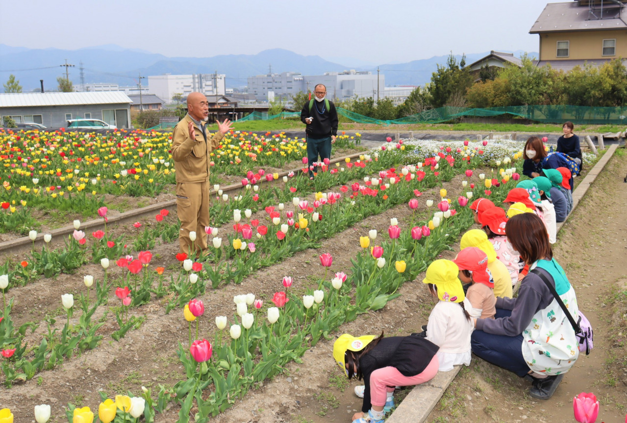 今年は約4万本にもなるチューリップ畑を整備し、色とりどりの美しいチューリップが多くの方を楽しませています。4月18日には、養基保育園や宮地保育園の園児たちが遊びにきました!